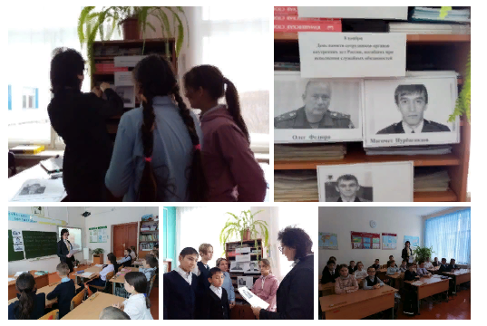 Советником директора по воспитанию Гизатуллиной И. Ф в МБОУ СОШ с. Юмашево были проведены следующие мероприятия : урок мужества "Герои нашего времени" совместно с Потаповой Л. М, оформление информационного стенда в библиотеке совместно с Булатовой Г. Я