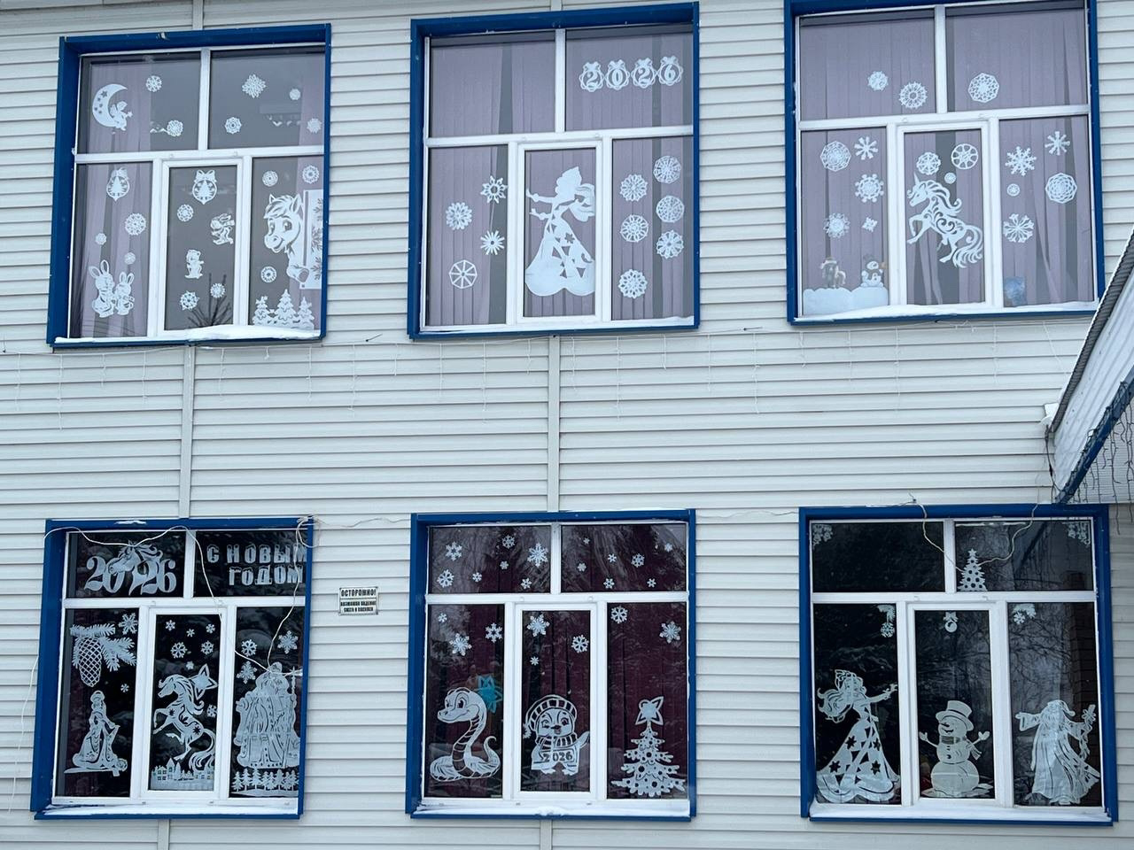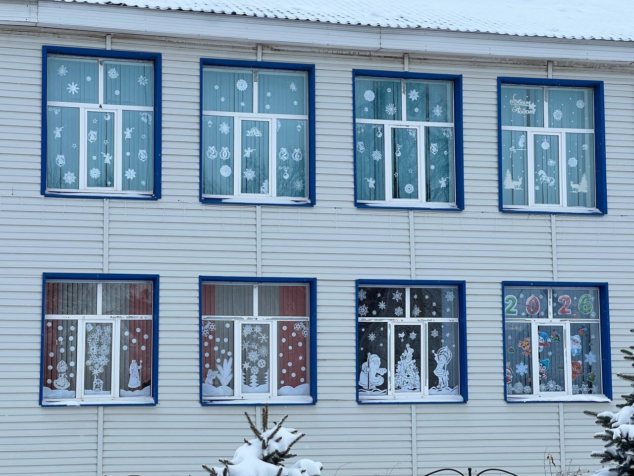 На окнах классов красуются яркие и красочные рисунки на тему зимы, Нового года и Рождества. Здесь можно увидеть заснеженные домики, счастливых снеговиков, нарядные елки и, конечно, Деда Мороза с подарками.